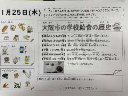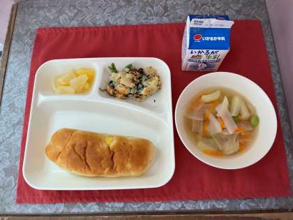 本日の献立は、ホタテ貝のグラタン、スープ、パインアップルの缶詰め、おさつパン、牛乳です。