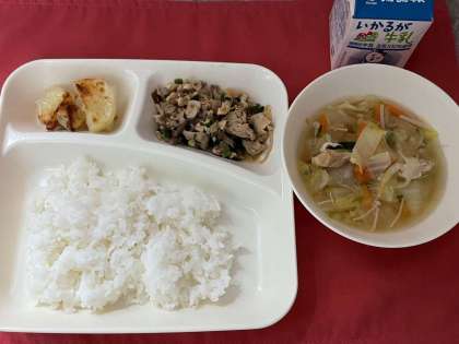 本日の献立は、豚肉と干しずいきのみそ煮、すまし汁、あげ焼きじゃが、ごはん、牛乳です。