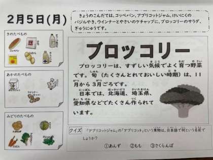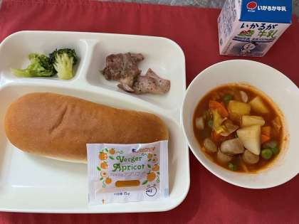 本日の献立は、鶏肉のバジル焼き、ウインナーと野菜のケチャップ煮、ブロッコリーのサラダ、コッペパン、アプリコットジャム、牛乳です。