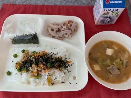 本日の献立は、鶏ごぼうごはん、みそ汁、焼きレンコン、牛乳です。
