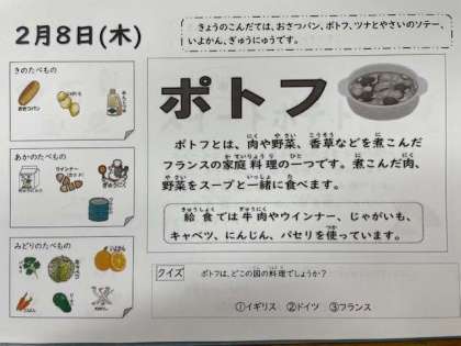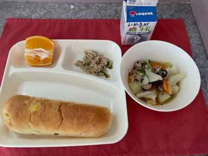 本日の献立は、ポトフ、ツナと野菜のソテー、おさつパン、いよかん、牛乳です。