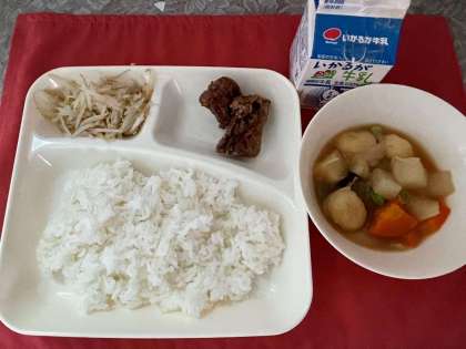 本日の献立は、クジラの竜田揚げ、丸天と野菜の煮物、もやしの生姜漬け、ごはん、牛乳です。