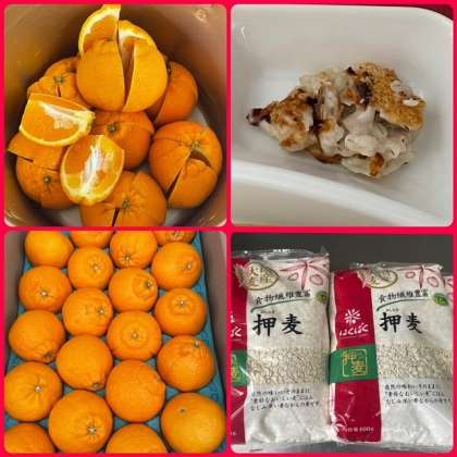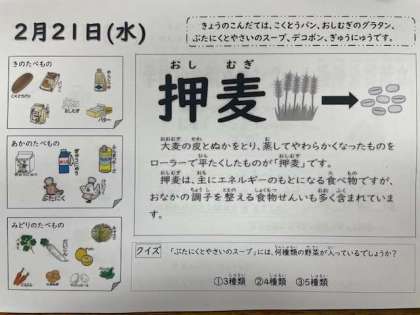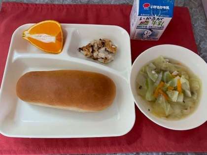 本日の献立は、押麦のグラタン、豚肉と野菜のスープ、デコポン、黒糖パン、牛乳です。
