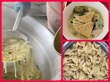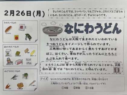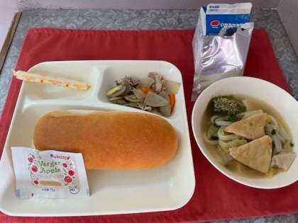 本日の献立は、なにわうどん、豚肉とごぼうの煮物、コッペパン、りんごジャム、棒チーズ、牛乳です。