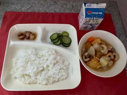 本日の献立は、関東煮、きゅうりの梅風味、とら豆の煮物、ごはん、牛乳です。