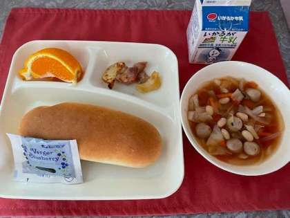 本日の献立は、鶏肉とじゃがいものガーリック焼き、ウインナーとてぼ豆のスープ、コッペパン、ブルーベリージャム、デコポン、牛乳です。