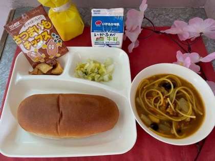 本日の献立は、カレースープスパゲッティ、キャベツのピクルス、おさつチップス、黒糖パン、牛乳です。