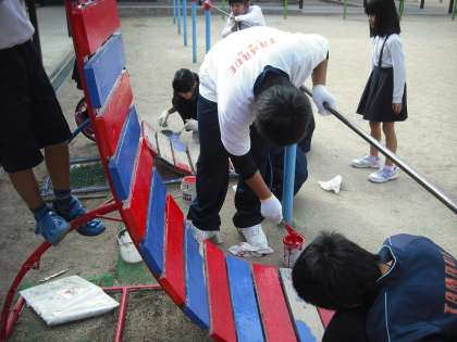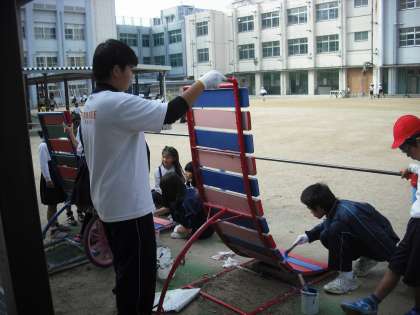 朝の挨拶から始まって、ピアサポートタイムでは、6年生に講話を、そしてペンキ塗り、1・2年生に読み聞かせと大活躍でした。6年生には、今、勉強しておくことが中学校では役に立つよと話してくれ、真剣に聞いている6年生でした。本当に頼もしい玉出小学校の卒業生4人でした。働くことの大切さ、厳しさも伝わったことでしょう。