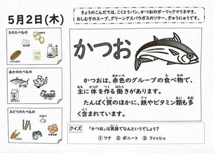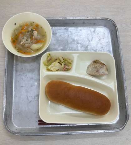 本日の献立は、かつおのガーリックマリネ焼き、押麦のスープ、キャベツとベーコンのソテー(献立が変更になっています)、黒糖パン、牛乳です。