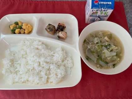 本日の献立は、鮭の胡麻みそ焼き、五目汁、えんどうの卵とじ、ごはん、牛乳です。