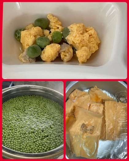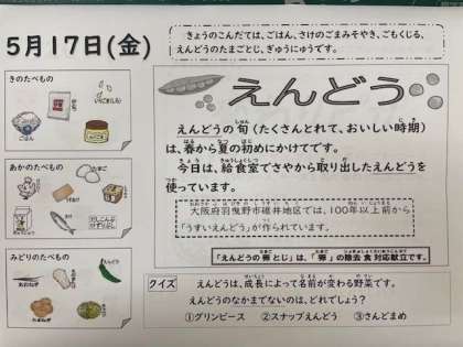 「えんどうの卵とじ」は、旬のさや付きのえんどうを、給食室でさやからむいています。