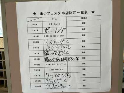 本日決まった「玉小フェスタお店決定一覧表」は、玄関に掲示しています。