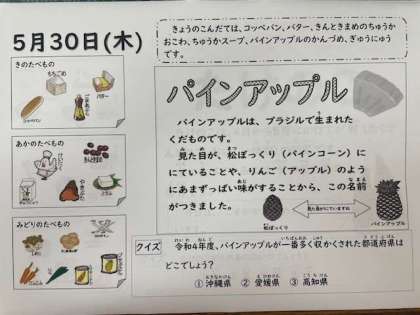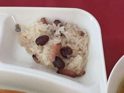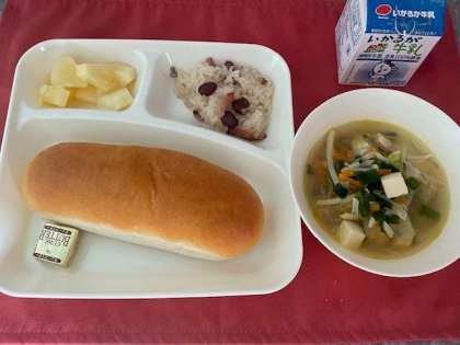 本日の献立は、金時豆の中華おこわ、中華スープ、コッペパン、バター、パインアップルの缶詰め、牛乳です。