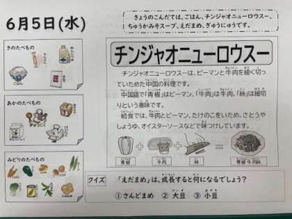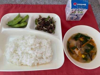 本日の献立は、チンジャオニューロースー、中華味噌スープ、枝豆、ごはん、牛乳です。