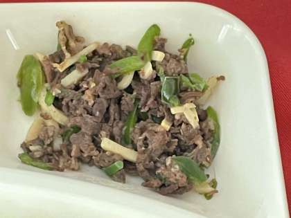「チンジャオニューロースー」は、中国料理で、牛肉と細切りにしたピーマン、たけのこを使い、砂糖、濃い口しょうゆ、オイスターソースで味付けしています。