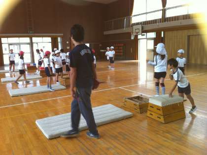 3年生の音楽と4年生の体育を交換授業をしています。3年担当の高尾先生が4年1組に体育の跳び箱運動の授業をしました。ipadを活用し、自分の跳んでいる様子を見ることで技が向上していきます。