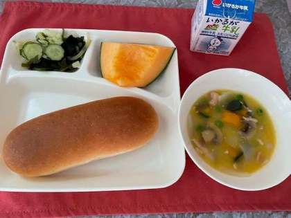 本日の献立は、鶏肉とかぼちゃのシチュー、ミックス海藻のサラダ、黒糖パン、クインシーメロン、牛乳です。