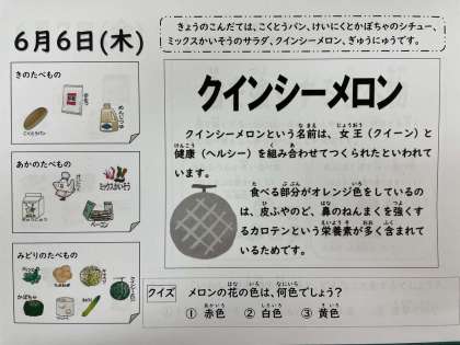 「クインシーメロン」は年に1回登場するデザートです。ご覧のようにとても新鮮なメロンを、1人、8分の1切れずついただきました。とても美味しかったです。