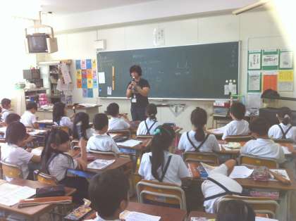 3年生と4年生の交換授業で、3年生の音楽を井原先生がしてくださっています。リコーダーの音色がとてもきれいでした。低いドやレは出にくいのですが、指の腹で穴をふさぐようにあててていねいに吹くことができていました。
