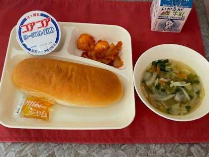 本日の献立は、えびのチリソース、中華スープ、コッペパン、みかんジャム、ヨーグルト、牛乳です。