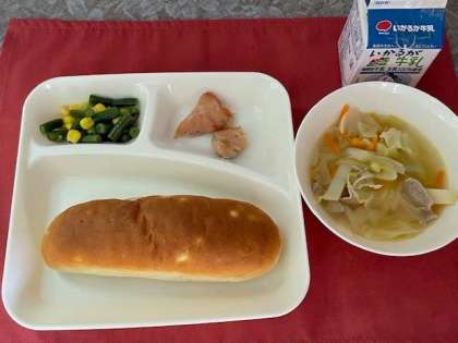 本日の献立は、鶏肉のガーリック焼き、スープ、三度豆とコーンのサラダ、おさつパン、牛乳です。