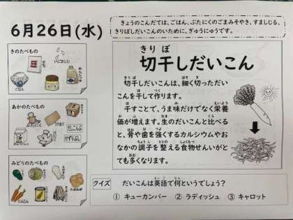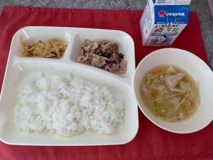 本日の献立は、豚肉のごまみそ焼き、すまし汁、切り干し大根の炒め煮、ごはん、牛乳です。
