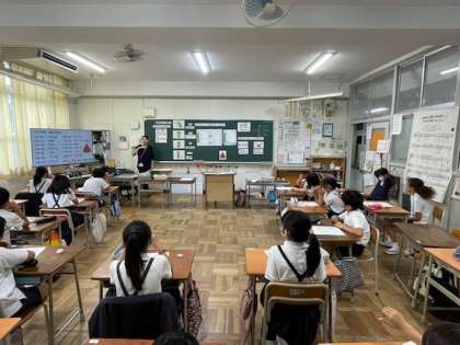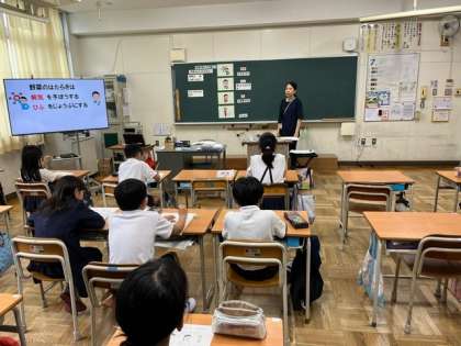 南津守小学校栄養教諭の奥埜先生に来ていただき、2時間目に4年2組、3時間目に4年1組において、「野菜を食べて元気に!」と題して出前授業をしていただきました。