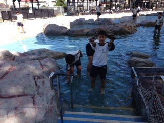 自分たちで作ったてこね寿司を昼食でいただき、わんぱく磯(人工磯)で遊んでいます。中には、泳ぎだす子もでてきたそうです。そろそろ海ほうずきを出発です。まだ、遊んでいたいのに〜