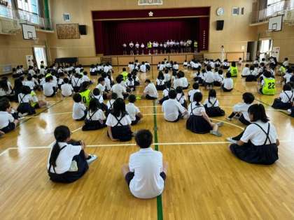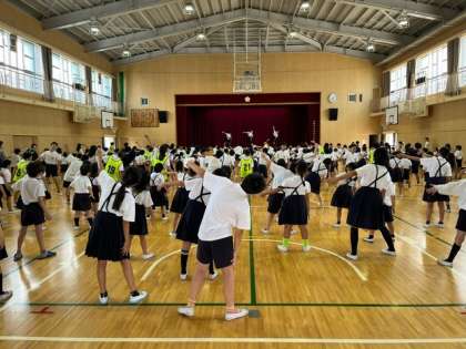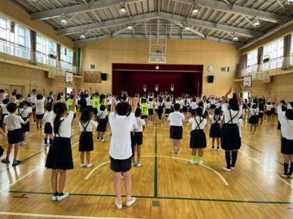 前に立っている集会委員会の皆さんの「うそラジオ体操」にだまされずに、各班の皆さんが、正しく「ラジオ体操」を行うことができるか、というゲームです。
