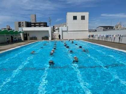 写真は、4年生、1年生の様子です。1年生は、浅い方の半面だけで水泳の授業を行っています。