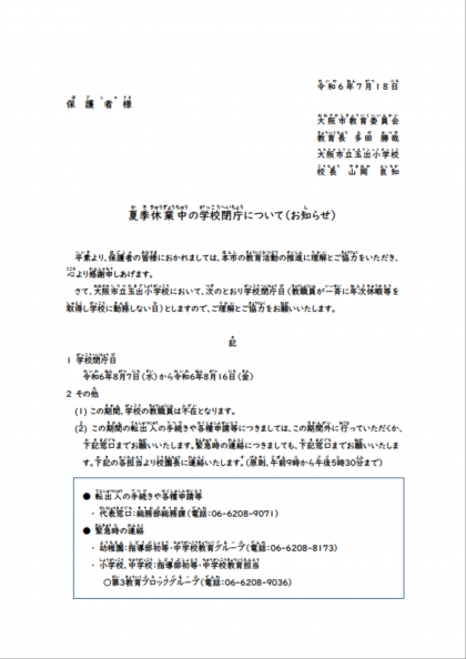 夏季休業中の学校閉庁について