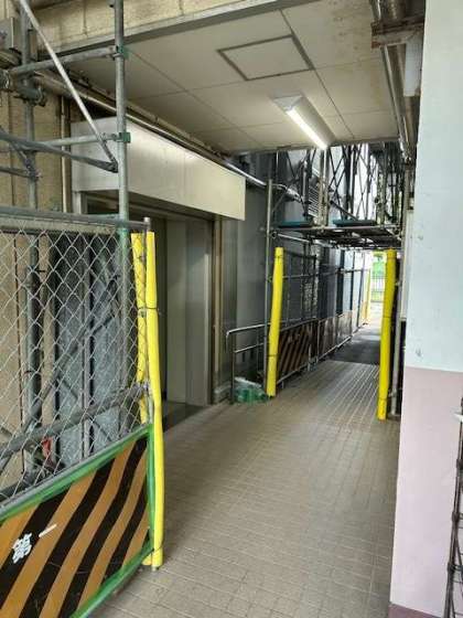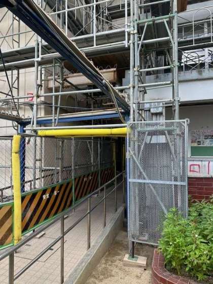 足場の設営により通路が狭くなっているところがございますので、来校の際にはお気をつけください。