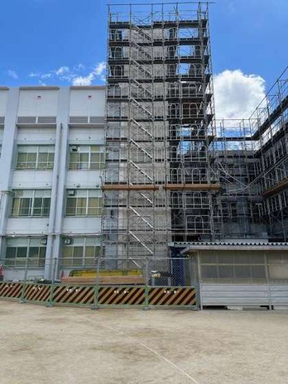 本年度、本校では給食棟の外壁改修と運動場の工事が行われ、夏休みから給食棟の外壁改修工事が開始されております。