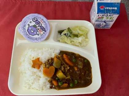 本日の献立は、ビーフカレーライス、野菜のピクルス、ぶどうゼリー、牛乳です。