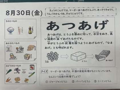 本日の献立は、マーボー厚揚げどんぶり、あっさりきゅうり、りんごの缶詰め、牛乳です。