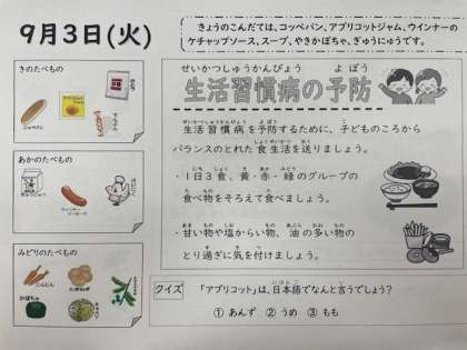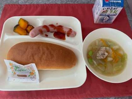 本日の献立は、ウインナーのケチャップソース、スープ、焼きカボチャ、コッペパン、アプリコットジャム、牛乳です。