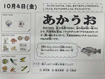 今日の献立は、「赤魚のしょうゆだれかけ」「豚汁」「きゅうりのゆず風味」「ごはん」「牛乳」です。
