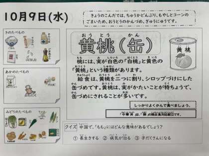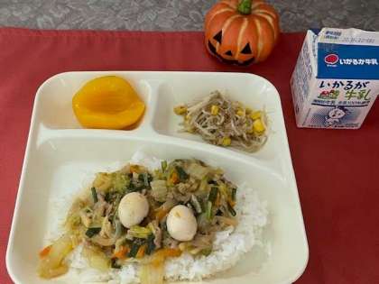 本日の献立は、中華丼、もやしとコーンの胡麻炒め、黄桃の缶詰め、牛乳です。