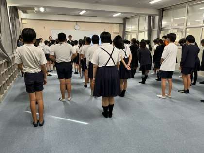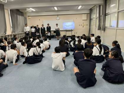 本日5時間目に、玉出中学校の生徒会役員のみなさんが、本校に来て、多目的室において、6年生の皆さんに、玉出小学校の学校紹介をしてくれました。