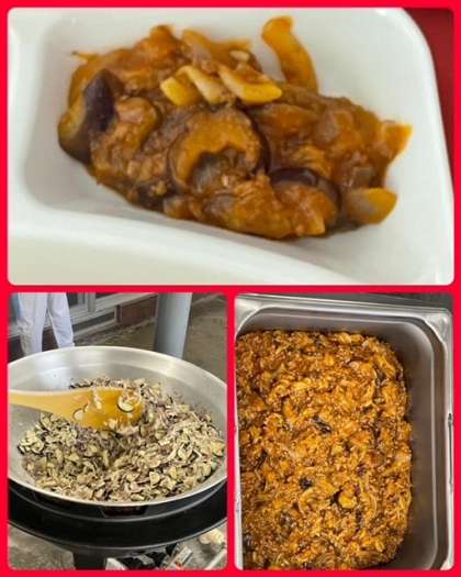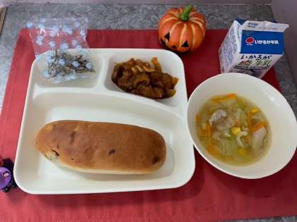 本日の献立は、なすのミートソース、鶏肉とキャベツのスープ、レーズンパン、ミニフィッシュ、牛乳です。