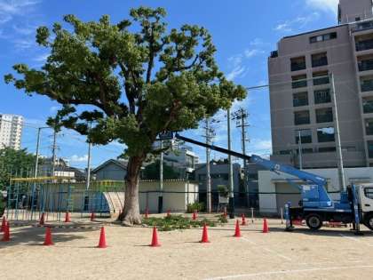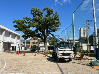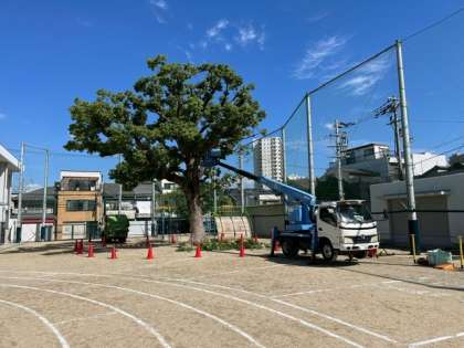 本日、業者の方に来ていただき、校庭の楠木の剪定をしていただきました。