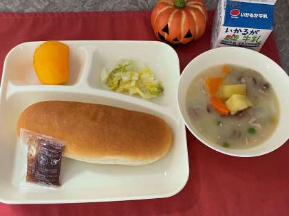 本日の献立は、鶏肉とさつまいものシチュー、白菜のピクルス、コッペパン、いちごジャム、柿(平たねなし柿)、牛乳です。