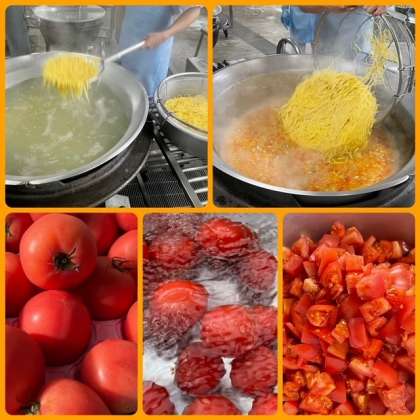 「トマトのスープスパゲッティ」には、ご覧のように新鮮な生のトマトを使用しています。オリーブ油でニンニクを香り良く炒めて風味を出し、鶏肉とベーコンで旨味を出しています。