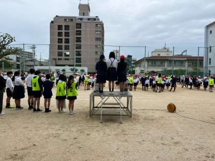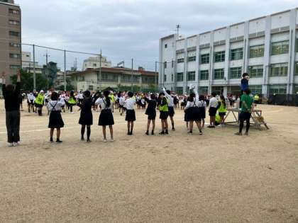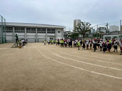 朝礼台の上で後ろを向いているの先生が「だるまさんがころんだ」と言っているあいだ、児童のみなさんが「お題」のジェスチャーをして、先生が「お題」を当てることができるか、というゲームです。