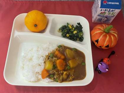 ポークカレーライスには、給食調理員さんが、ハロウインバージョンのラッキーにんじんをつくって入れてくださっています。