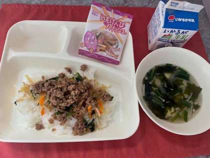 本日の献立は、ビビンバ(肉・野菜)、わかめスープ、芋けんぴフィッシュ、牛乳です。