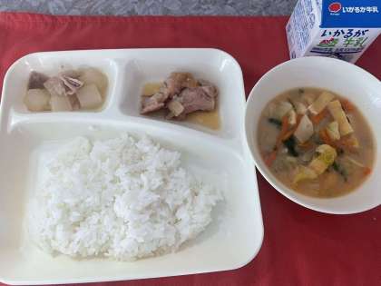 本日の献立は、鶏肉の甘辛焼き、みそ汁、大根の煮物、ごはん、牛乳です。