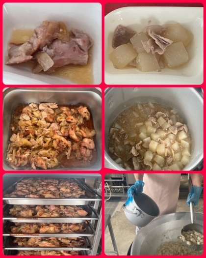 「鶏肉の甘辛焼き」は、鶏肉を料理酒、砂糖、みりん、濃い口醤油で下味をつけ、玉ねぎを混ぜ合わせて、焼き物機で焼いています。