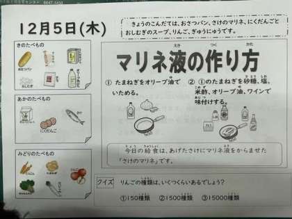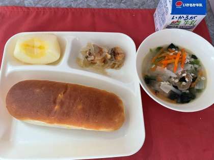 本日の献立は、鮭のマリネ、肉団子と押し麦のスープ、おさつパン、りんご、牛乳です。