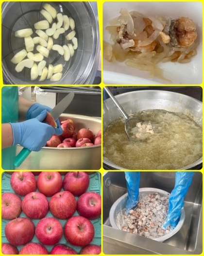 デザートの新鮮なりんごは、ご覧のように調理員のみなさんが、1つ1つ手で皮をむいてくださっています。